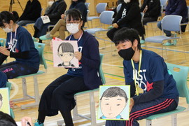 そして1・2年生の出番です。1・2年生の出し物は,「かさこじぞう」になぞらえた劇のシナリオに沿って,6年生に手作りのプレゼントを渡すというもの。1・2年生のかわいらしい演技を6年生が優しく見守ります。劇中でかさをかけてくれた6年生に似顔絵と手作りプレゼントを渡し,感謝の気持ちを伝えました。似顔絵を受け取った6年生はいろいろな意味で楽しめたようです。