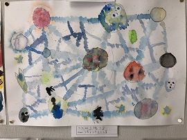 3年生:絵の具のにじみを生かした作品 4年生:想像の物語世界を描いた作品