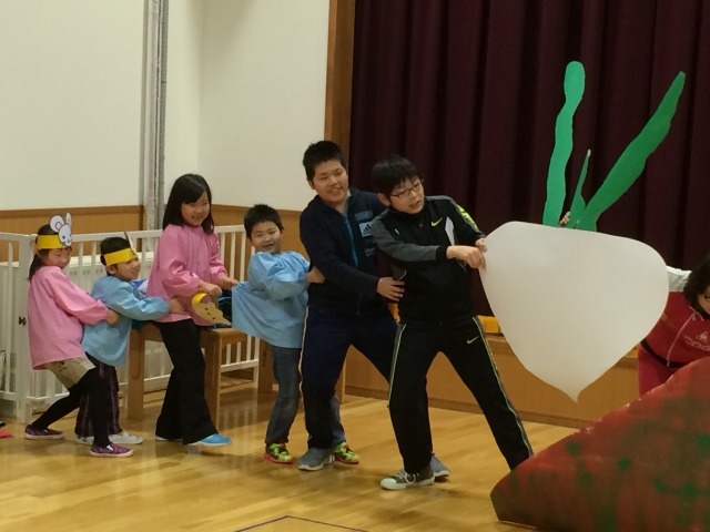 保育所の園児の真剣で楽しげな眼差しをたくさん受けながら一生懸命、