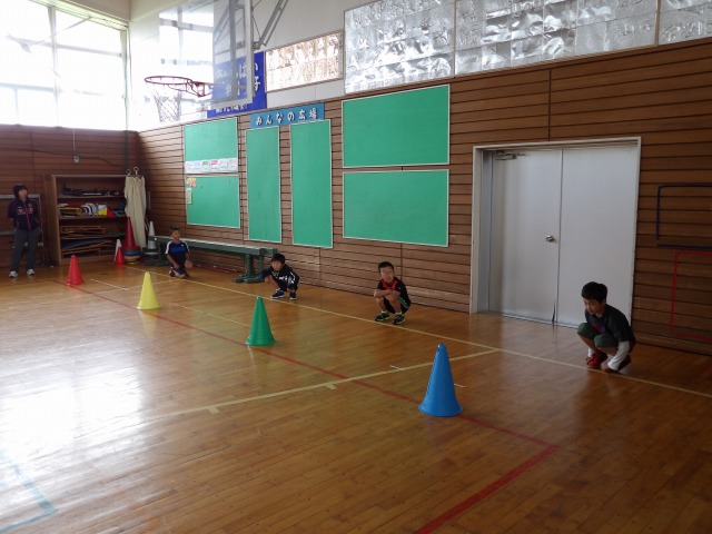 今日は、体育館で、陸上記録会の練習をすることにしました。