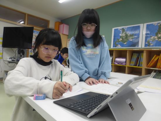 以下4年 国語 ペアで学習を深めています。タブレットで プレゼン発表資料作成していました。