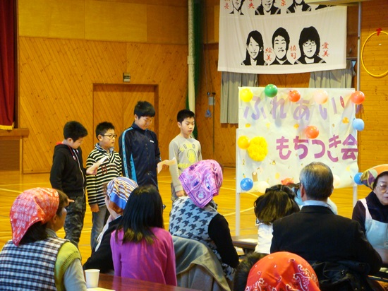 本日予定していた「ふれあいもちつき会」が無事終了しました。荒れ模様の天候にもかかわらず、1時間目の授業参観からたくさんの祖父母の皆様方が駆けつけて下さり、もちつき会が始まる頃には50名ほどの皆様が香中の体育館に集まっていただいて、児童会役員の子ども達の司会進行でもちつき会がスタートしました。児童会長のまさよし君の挨拶の後、全校児童41名で「すてきな友達」を合唱。その後もちつきが始まり、3つの班毎に、おじいちゃんやおばあちゃんのリードでそれぞれあっという間に二臼ずつのもちがつき上がり、みんなで丸めて、それをお雑煮にして会食となりました。会食後は、みんなでクイズ大会を行い、最後には子ども達が一生懸命作ったプラバンのキーホルダーとメッセージカードがプレゼントされて、およそ2時間のもちつき会は終了となりました。